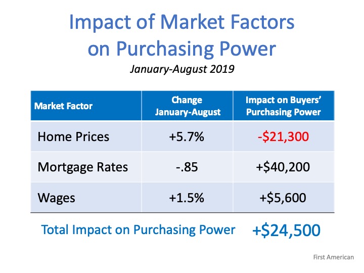 “The 0.85 percentage point drop in mortgage rates from January 2019 through August 2019 increased affordability by 9.7%. That translates to a $40,200 improvement in house-buying power in just eight months.”