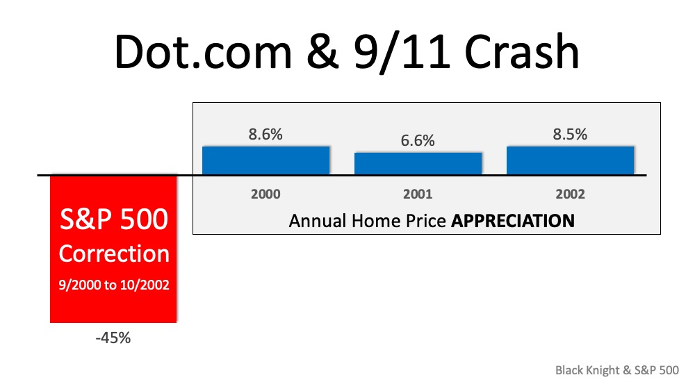 Since the current situation resembles the stock market correction in the early 2000s, let’s review what happened to home values during that time.