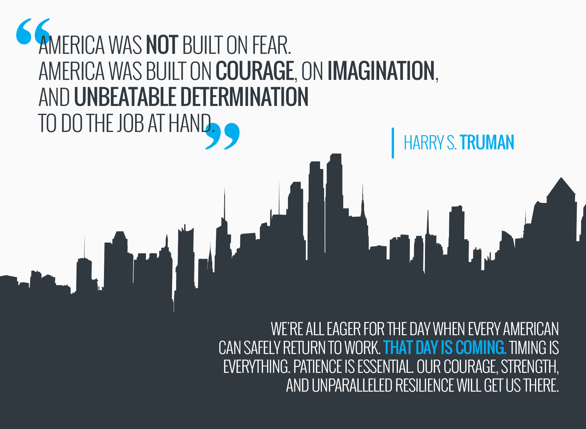 - We’re all eager for the day when every American can safely return to work. That day is coming. Timing is everything. Patience is essential.