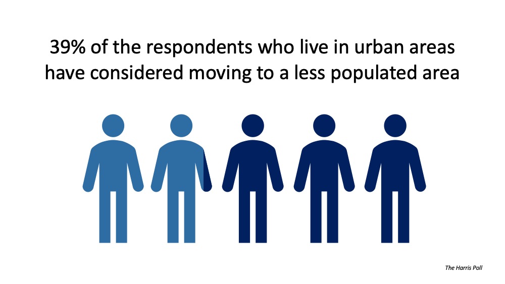The Harris Poll recently surveyed 2,000 Americans, and 39% of the respondents who live in urban areas indicated the COVID-19 crisis has caused them to consider moving to a less populated area.