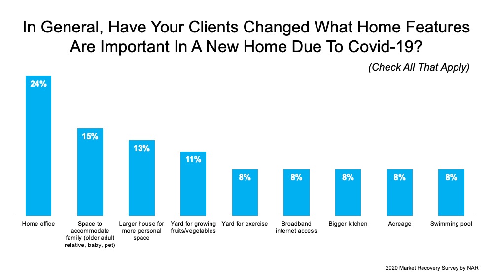 The latest Market Recovery Survey from NAR shares some of the features and amenities buyers are looking for, especially since the health crisis has shifted many buyer priorities. The most common home features cited as increasingly important are home offices and space to accommodate family members new to the residence (See graph below):