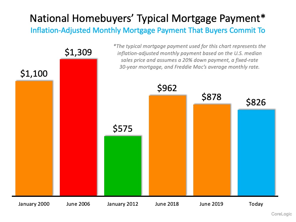 For example, here’s the typical mortgage payment for assorted dates going back to 2000, as calculated by CoreLogic:47% of New Buyers Surprised by How Affordable Homes Are Today | Simplifying The MarketOutside of the housing crash (when short sales and foreclosures drove prices down), it’s more affordable to buy a home today when you consider all three elements of the affordability equation: price, income, and mortgage rate.