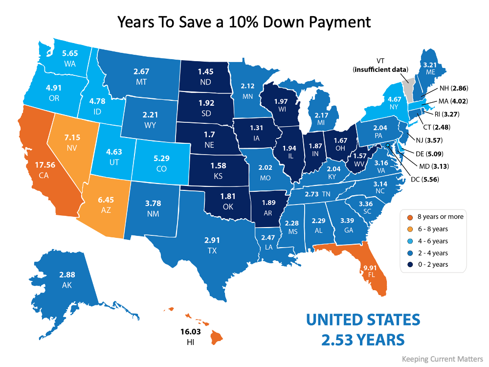 According to the data, the national average for the time it would take to save for a 10% down payment is right around two and a half years (2.53). Residents in Iowa can save for a down payment the fastest, doing so in just over one year (1.31). The map below illustrates this time (in years) for each state:How Much Time Do You Need To Save for a Down Payment? | Simplifying The Market