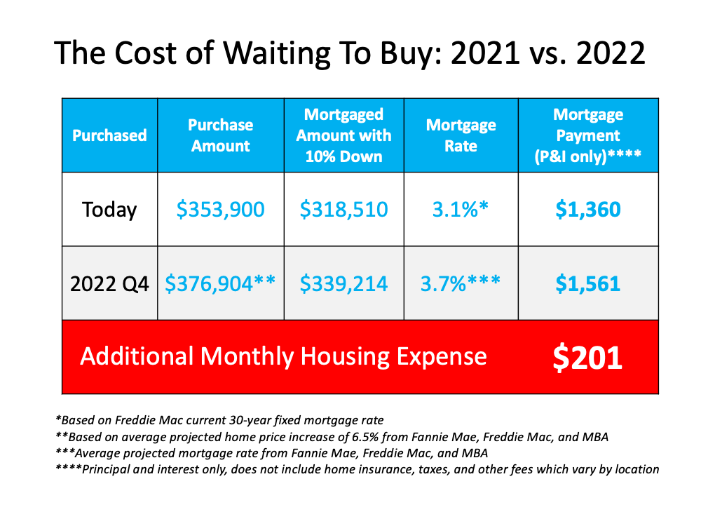 According to the National Association of Realtors (NAR), the median price of a home today is $353,900. Using an average of the three price projections above (6.5%), a home that sold for $353,900 today would be valued at $376,904 at the end of next year. As a prospective buyer, you would therefore pay an additional $23,004 by waiting.